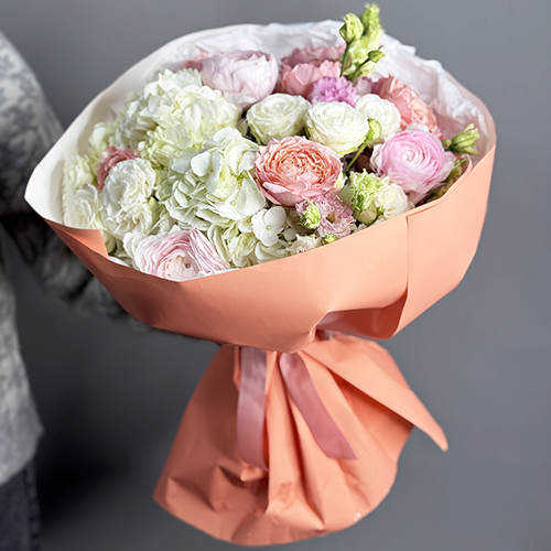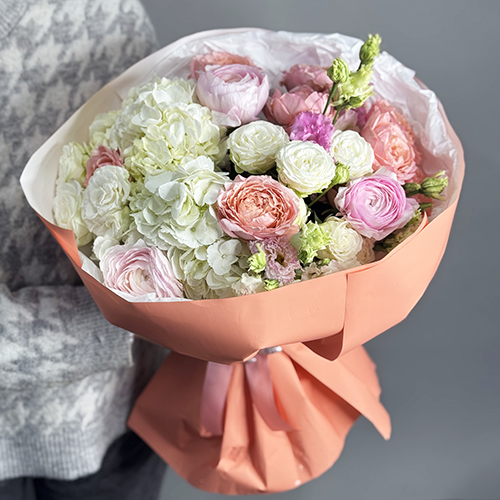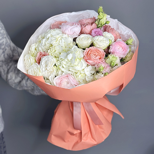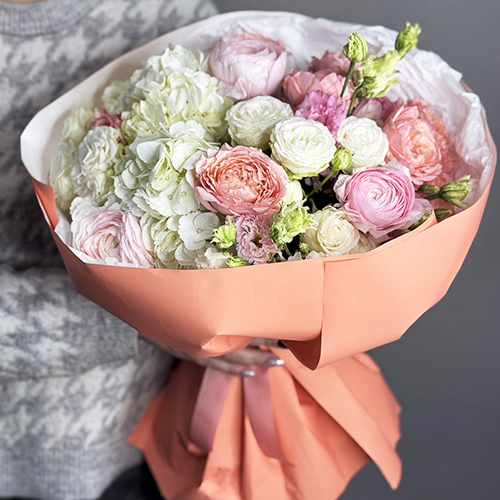 Букет "Мармеладка" из ранункулюсов, гортензии, эустомы и пионовидных роз